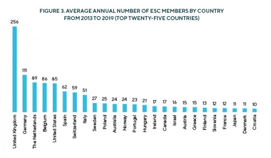 In 2019, ESC Members came from 54 countries (57 if figures for the United Kingdom are breakdown by nations), covering the five continents. The United Kingdom remained the most well represented country with 299 members, followed by Belgium (137 members), the Netherlands (130), Germany (124), the United States of America (96), Spain (83), Switzerland (58), Italy (55), Poland (39), Israel (33), Australia (29), Norway (25), Ireland (24), Canada and Sweden (21), Portugal (19), Finland (16), France and Hungary (13), Austria, Denmark, Greece and Japan (12), Slovenia (11), Croatia (10), the Czech Republic (8), Bosnia and Herzegovina, Iceland and Turkey (6), Lithuania and Russia (5), China and Romania (4), Indonesia, Malta, Mexico, Serbia and the Slovak Republic (3), Cyprus, Kosovo, Latvia, New Zealand and Nigeria (2), Argentina, Azerbaijan, Brazil, Chile, Estonia, Korea, Luxembourg, Moldova, North Macedonia, Saudi Arabia, South Africa, Uganda and Ukraine with one member each.